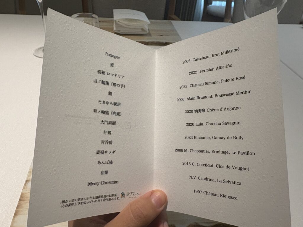 アミューズとデザートを除くすべての皿が両店によるコラボレーションで、この日限りの特別な内容。冬のジビエをテーマとしたコースには、雉、狸、月ノ輪熊、仔猪、青首鴨など多彩なジビエがほぼ全皿に使われており、非常に満足度の高い構成でした。
