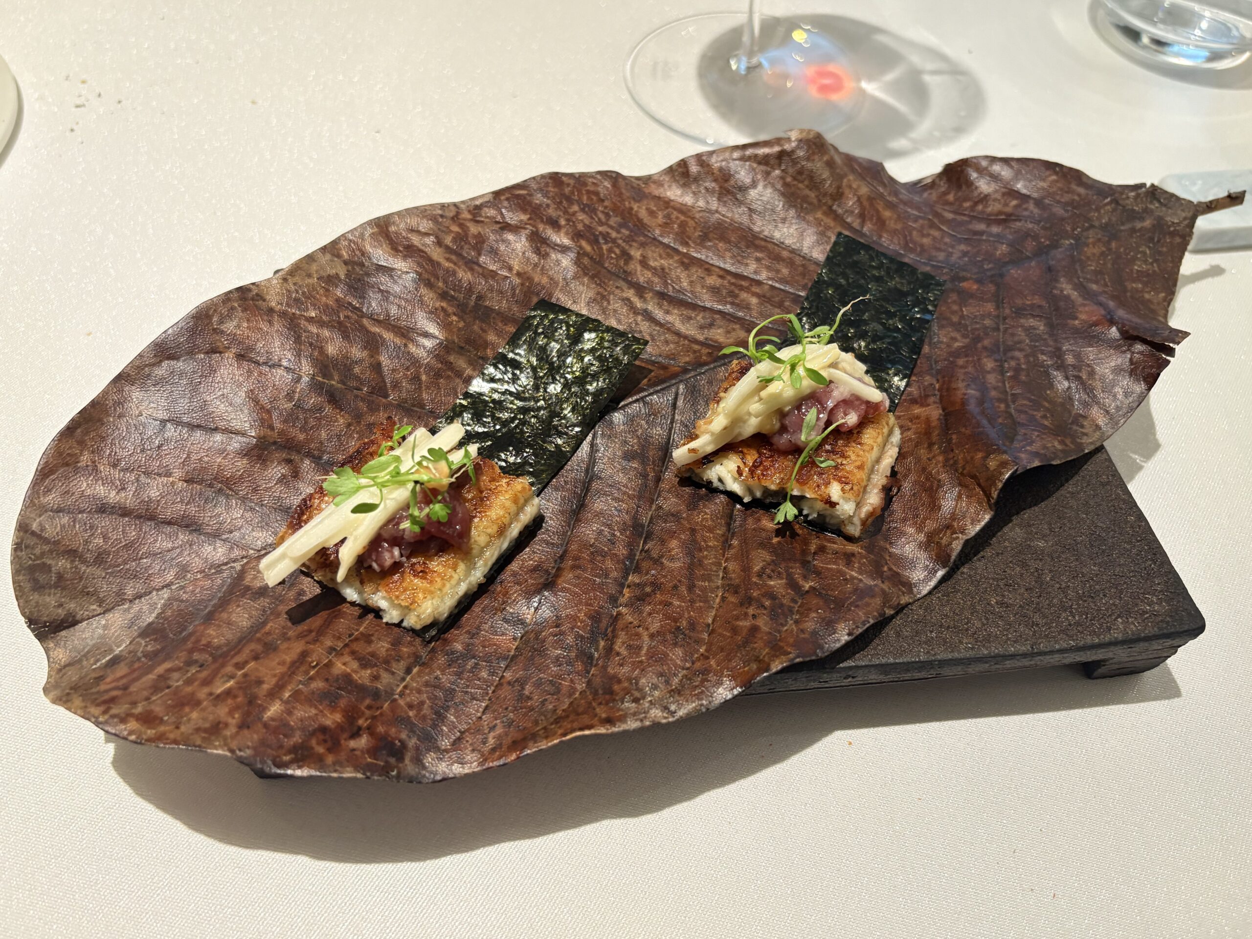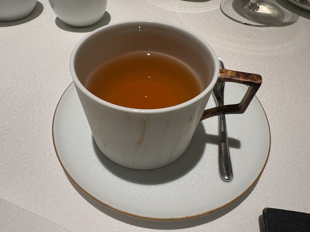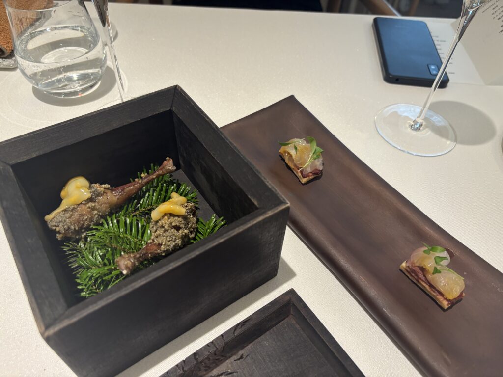 海苔で巻いていただく。鰻やブルーチーズ、熊など味や旨味の強い食材が重なるもぶつかり合っていない。鰻や海苔の味や香りを邪魔しない綺麗な熊。和の要素はありながら食べてみるとフランス料理。複雑さはありながら混沌としていないバランス感が素晴らしかった。