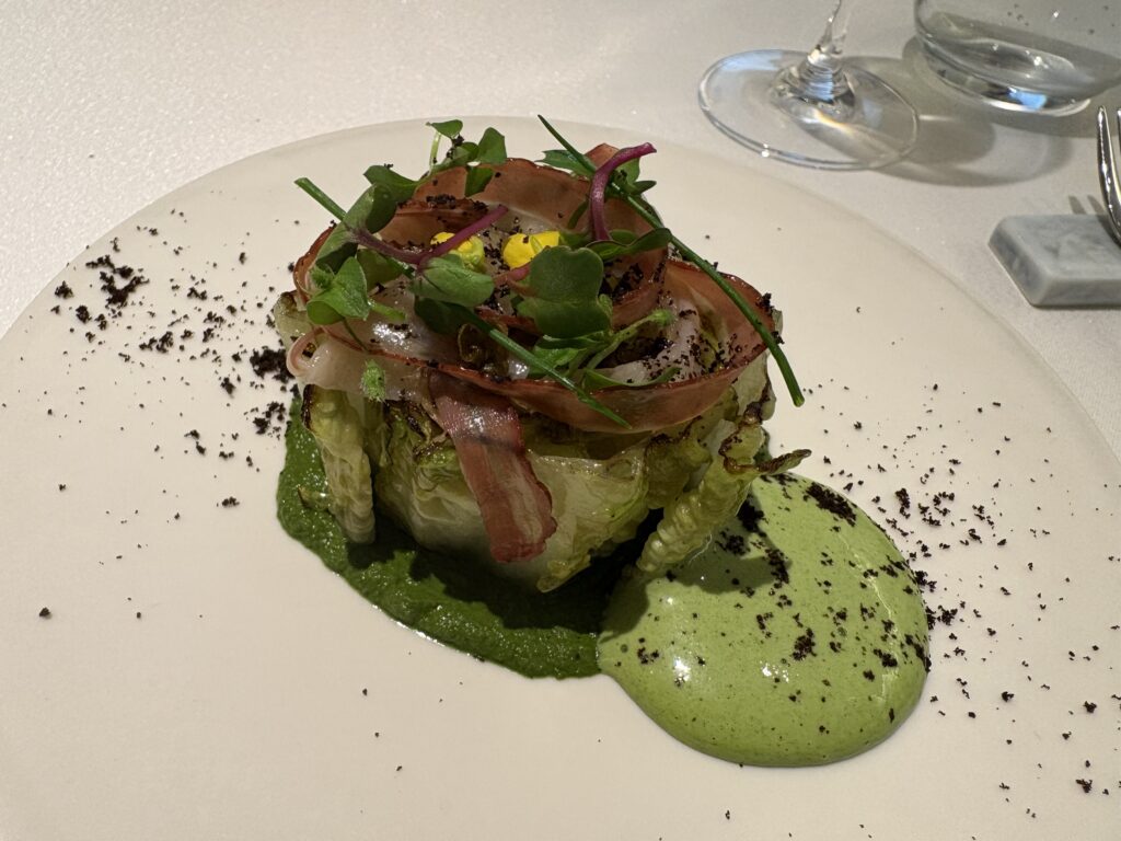 愛ふぁーむプロジェクト(しょうがい者の皆さんが作る地産地消のお野菜。その美味しさを知っていただく取り組み)のロメインレタスを炭火で焼いたもの、狸のベーコン、はこべら、シブレット、バジルとエストラゴンの泡