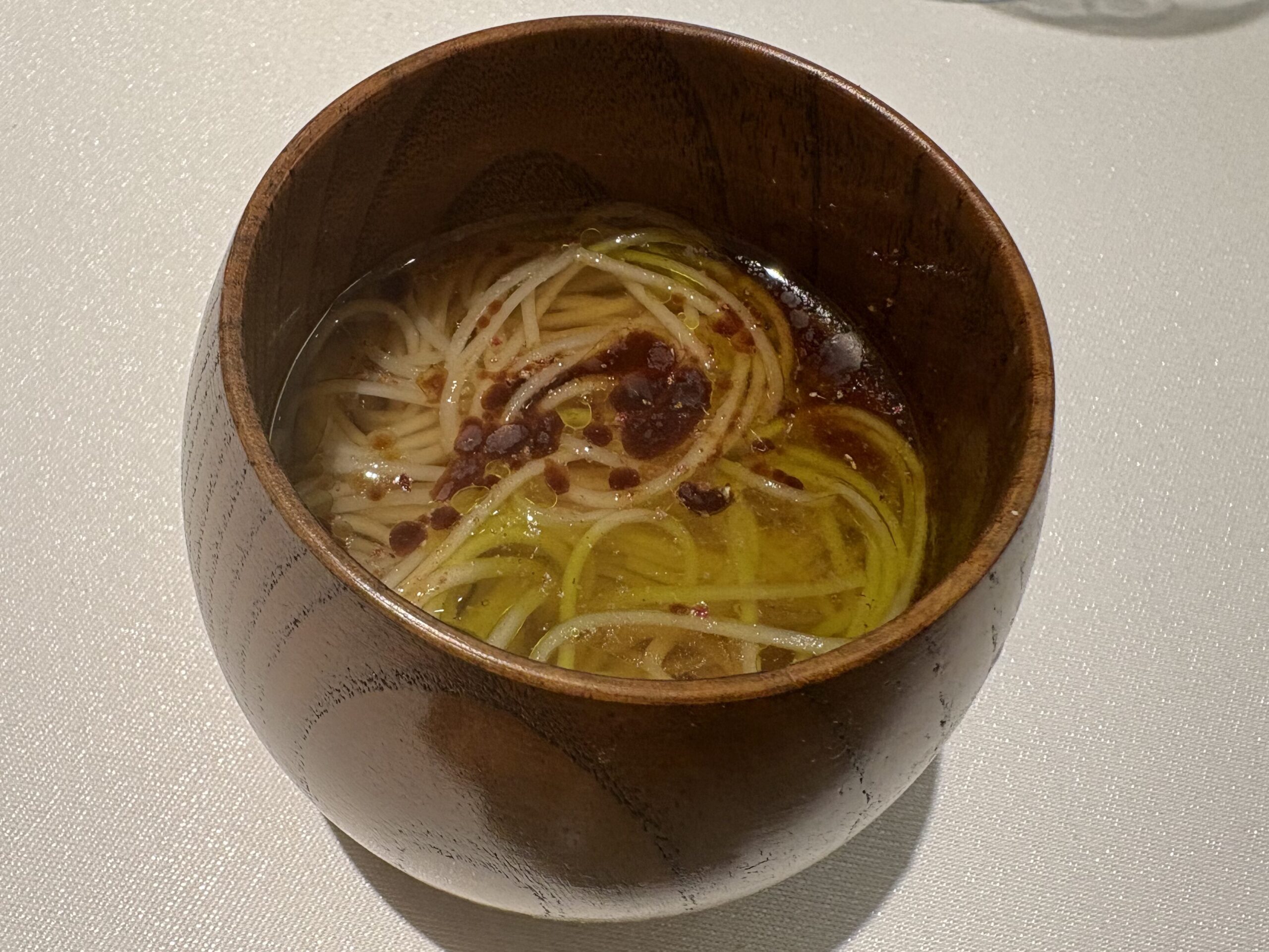 富山の砺波市の大門素麺をアルデンテで。御神水のブイヨンを鹿の血で澄まして。味噌、完熟山椒、蕗の薹のオイル