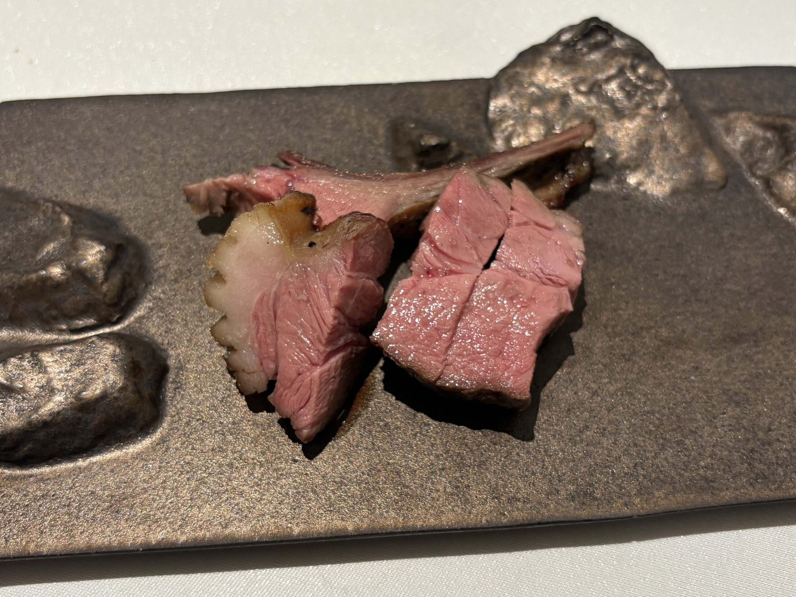 火入れが素晴らしい。ぷっくりと膨らみ艶やかな肉はもっちり感があり、非常に歯切れが良い。普段食べている豚肉や牛肉に戻れなくなってしまいそうなくらい味が濃く、雑味がない綺麗な味わい。噛み締めるほどに溢れる旨みに唸りっぱなしだった。素材の力と、それを最大限に引き出す火入れの技術が、はっきりと伝わってくる一皿だった。