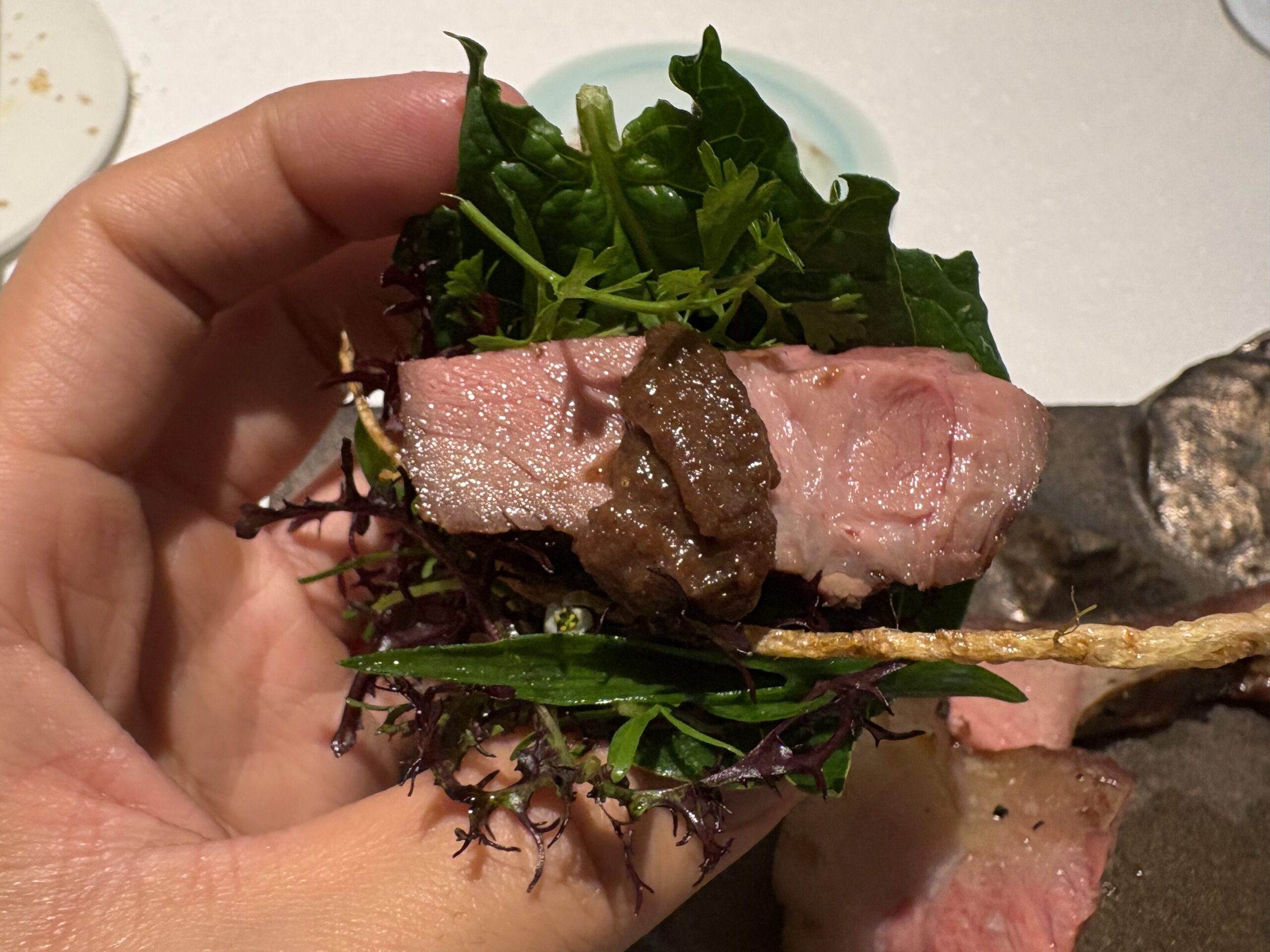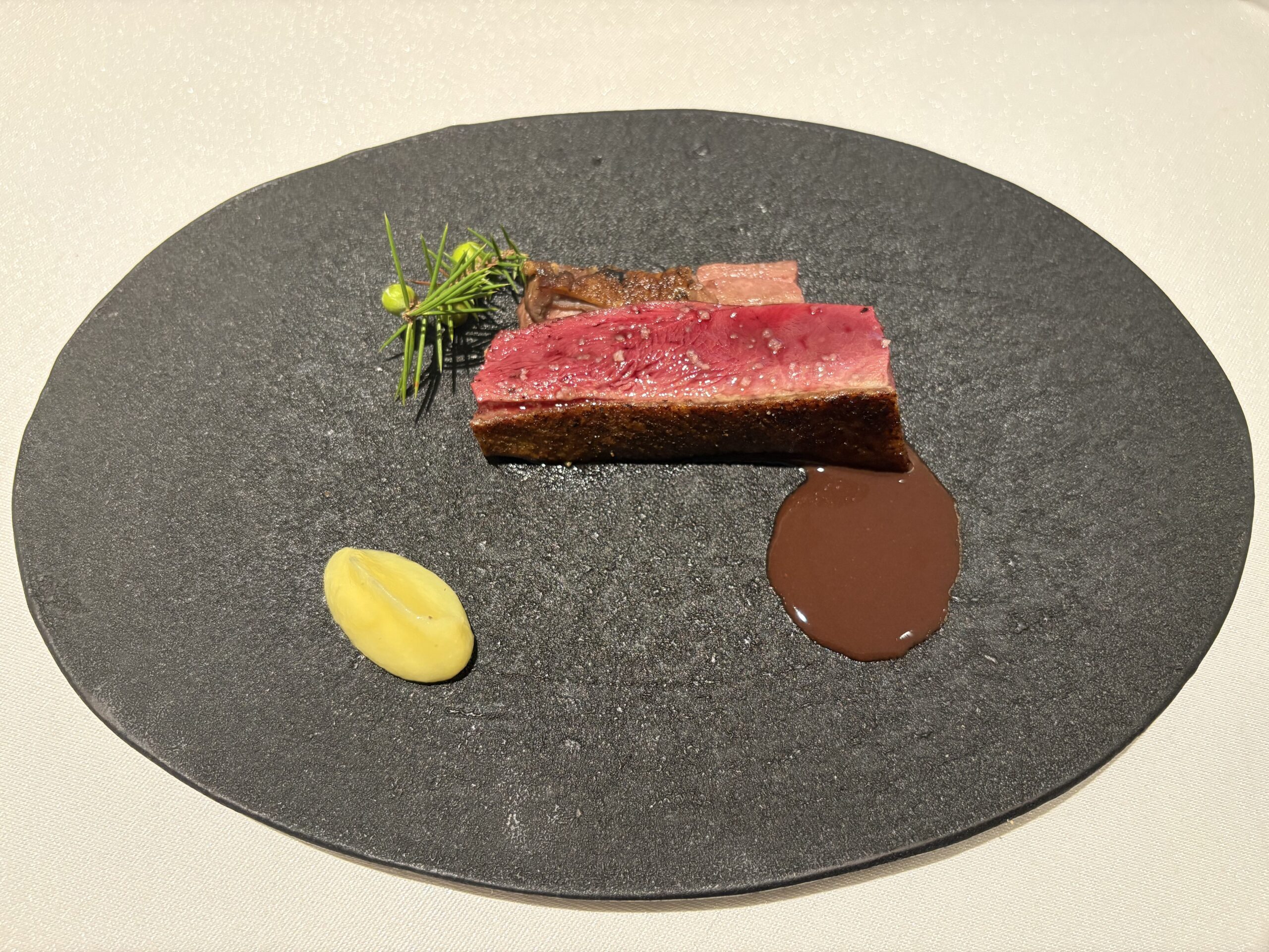 また、そのクリーンな味わいは他の食材と合わせた際にも際立っていました。ジビエの存在感はありながらネガティブな要素が全くないので主張が過剰になることはなく、時に主食材の旨味を下支えし、時に相乗効果を生み出しながら、一皿の中に心地よい余白を生んでいました。ジビエを深く理解し、的確に扱える料理人が手がけるとここまで表現の幅が広がるのかとその可能性を強く感じさせられました。