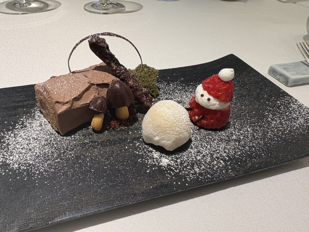あんぽ柿の甘味、ねっとり感が美味しい。マスカルポーネの心地よい酸味や柚子の香りで後味は驚くほど軽やか。冬らしさと余韻を感じさせるデザートだった。